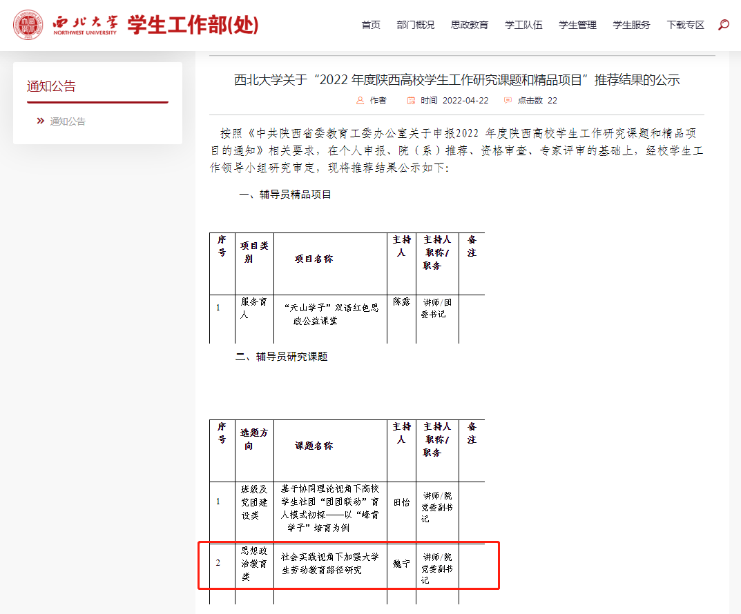 4月25日,学校公布了2022年度员工思想政治教育工作研究课题立项结果,公司3个项目获批立项,其中重点项目2项,一般项目1项。由范铭沁申报的《社会实践视角下加强老员工劳动教育路径研究》和郭佳惠申报的《产学研合作模式下老员工思政教育改革路径研究——以威廉williamhill体育华大创新班为例》获批重点项目,常雅慧申报的《新时代高校员工党员劳动教育的价值目标与实践进路》获批一般项目。其中,《社会实践视角下加强老员工劳动教育路径研究》被推荐为2022年度陕西高校员工工作研究课题。