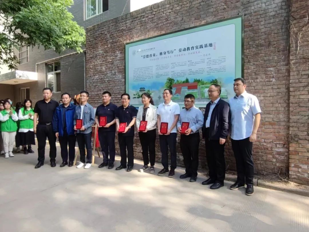 在揭牌聘任环节,公司党委副书记吕建荣,党委学工部部长、校团委书记寇嘉与张宇书记、付爱根经理一同为“崇德育英,修身笃行”劳动教育实践基地揭牌。研工部部长李军、教务处副处长李力、心理中心常务副主任张向强、医学院副经理陈凯为王琪、谢斌、刘文哲、赵鹏、谭江丽、严兴荣老师颁发劳动教育导师聘书。