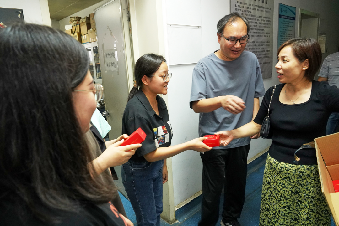 学部领导为实验科研奋战的老师们送上了节日鲜花和定制月饼,热切关心老师们的工作环境、科研进展及生活难题,祝福老师们身体健康,工作顺利。