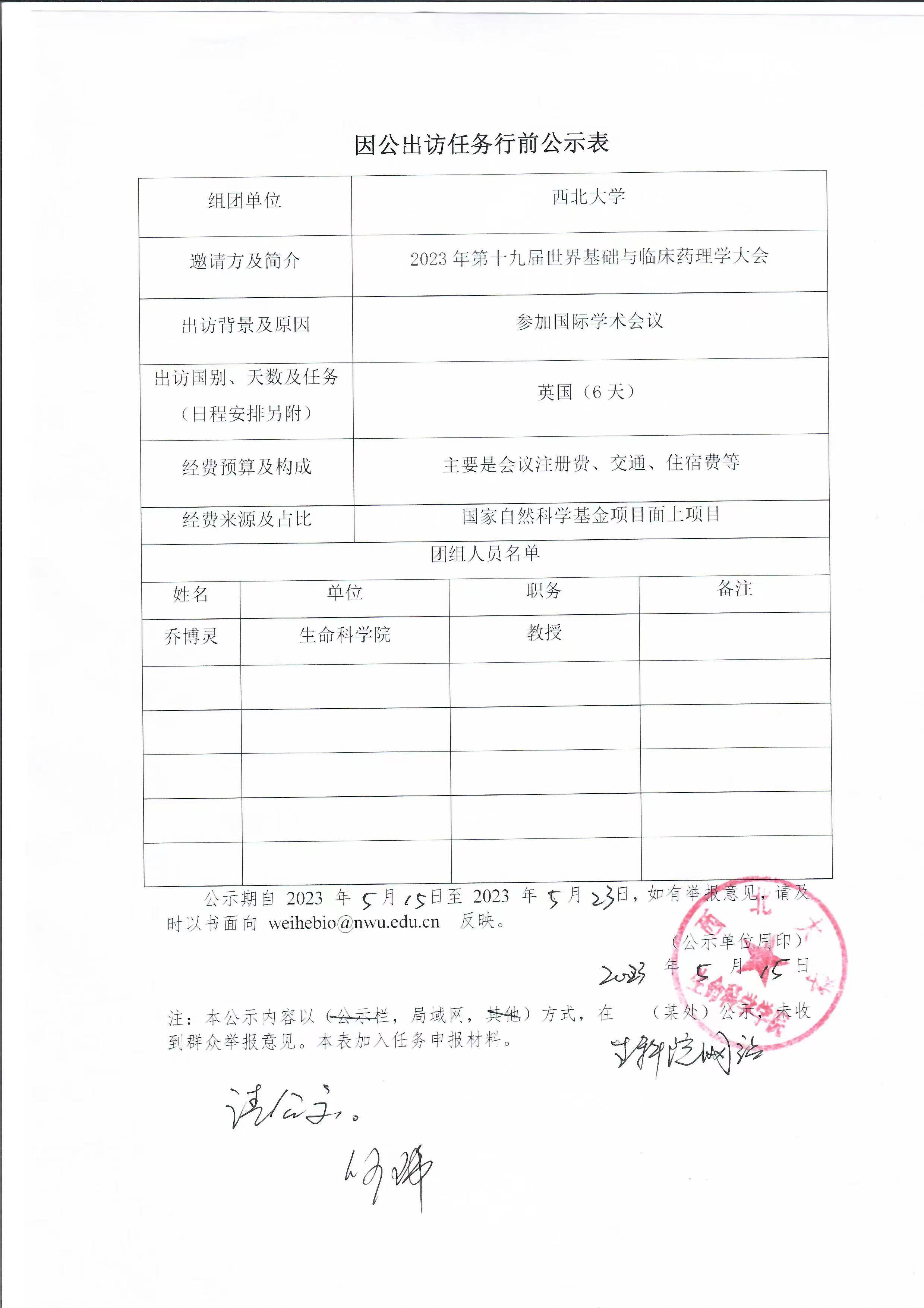 因公出访任务行前公示表